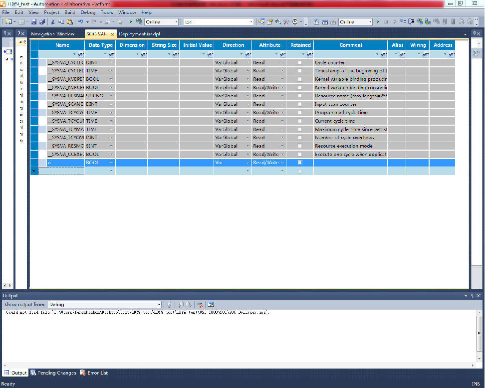 工程创建完毕后,点击“Solution Explorer”下的“Global Variables”,创建一个全局变量,创建该全局变量时,不需要设置变量地址。目前,USC-8000系统支持配置3种类型的全局变量,分别为BOOL型、INT型和REAL型。例如,设置的全局变量名称为a,数据类型为BOOL型,该变量可读/写,地址暂时为空。